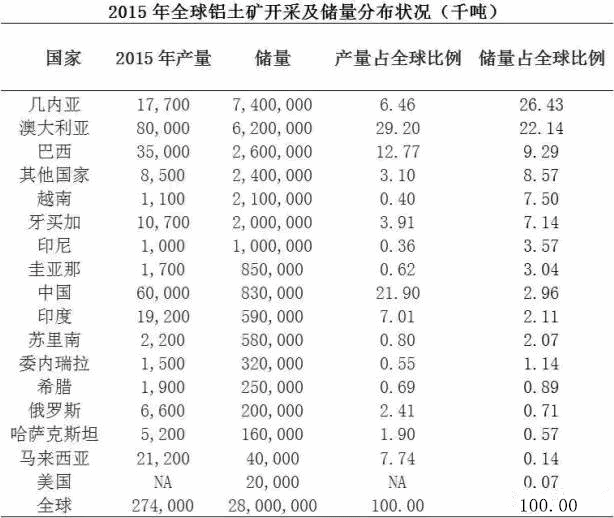 截至2015年底,全球探明鋁土礦儲(chǔ)量為280億噸,幾內(nèi)亞鋁土礦儲(chǔ)量為74億噸;澳大利亞鋁土礦儲(chǔ)量為62億噸,兩國(guó)合計(jì)約占全球儲(chǔ)量的50%。