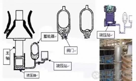 過鐵時液壓油注入蓄能器,主軸下墜,排料口增大