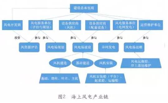海上風(fēng)能利用的不斷增加也必將帶動產(chǎn)業(yè)鏈內(nèi)的各相關(guān)行業(yè)發(fā)展。海上風(fēng)電產(chǎn)業(yè)的運(yùn)行,以海上風(fēng)電投資企業(yè)為主導(dǎo)和驅(qū)動力,其總投資量在很大程度上決定了風(fēng)電項(xiàng)目的規(guī)模和相關(guān)企業(yè)的獲利大小;以海上風(fēng)電設(shè)備制造業(yè)為硬件供應(yīng),廣義上的風(fēng)電設(shè)備供應(yīng)應(yīng)當(dāng)包括風(fēng)機(jī)整機(jī)供應(yīng)和相關(guān)海上風(fēng)電工程裝備供應(yīng)??傮w來說,海上風(fēng)電產(chǎn)業(yè)鏈的運(yùn)行主線為:風(fēng)資源評估―風(fēng)電場規(guī)劃―風(fēng)電場建設(shè)―并網(wǎng)發(fā)電―風(fēng)電場運(yùn)維。