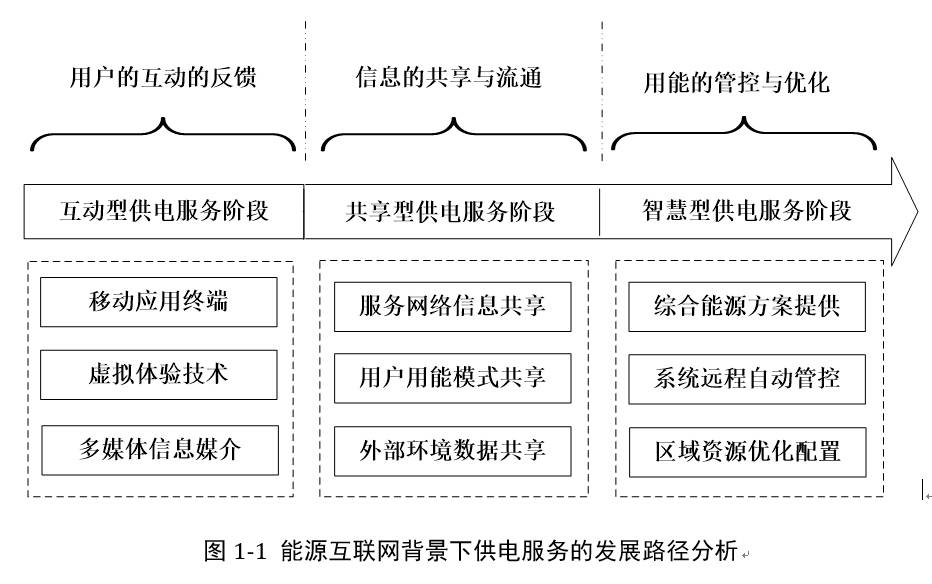 作為電力企業(yè)為用戶(hù)提供安全可靠電力的基礎(chǔ)環(huán)節(jié),供電服務(wù)在能源互聯(lián)網(wǎng)背景下的發(fā)展也將呈現(xiàn)出多元化的趨勢(shì),供電服務(wù)也從傳統(tǒng)的單一模式開(kāi)始走向與用戶(hù)的深度對(duì)接,其發(fā)展的趨勢(shì)大致可以分為互動(dòng)型供電服務(wù)、共享型供電服和智慧型供電服務(wù)三個(gè)階段,具體如圖1-1所示: