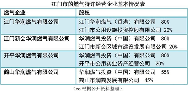 不同于廣州、深圳和佛山三地的燃?xì)馄髽I(yè)由地方國資主導(dǎo),江門的合資燃?xì)夤局饕扇A潤燃?xì)饨^對控股。