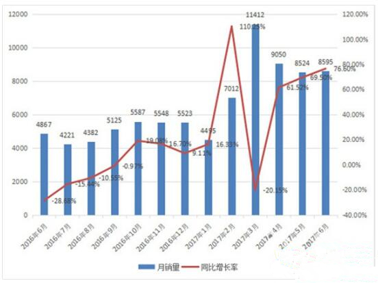2016年6月-2017年6月份裝載機(jī)月銷量情況