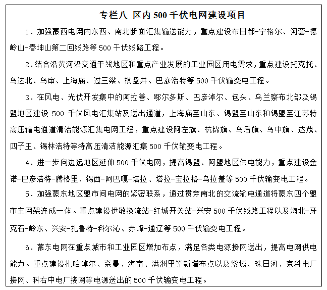 加快新能源外送基地建設(shè)。優(yōu)化配電網(wǎng)、匯集站規(guī)劃和建設(shè),加強風能、太陽能等新能源匯集能力和效率,著力打造阿拉善(烏海、巴彥淖爾)、包頭北(巴彥淖爾)、鄂爾多斯(巴彥淖爾、烏海、阿拉善)、烏蘭察布(呼和浩特)、錫林郭勒、赤峰、通遼、呼倫貝爾(興安)等8個新能源基地。重點依托錫盟-山東、錫盟-江蘇、上海廟-山東、蒙西-天津南、扎魯特-山東青州等電力外送通道,加快推進通道配套外送新能源項目建設(shè),積極推動赤峰、蒙西(烏蘭察布、包頭、阿拉善等)清潔能源外送基地開展前期工作?!笆濉逼陂g,力爭新增新能源外送裝機2300萬千瓦左右,其中風電1800萬千瓦,太陽能發(fā)電500萬千瓦左右。