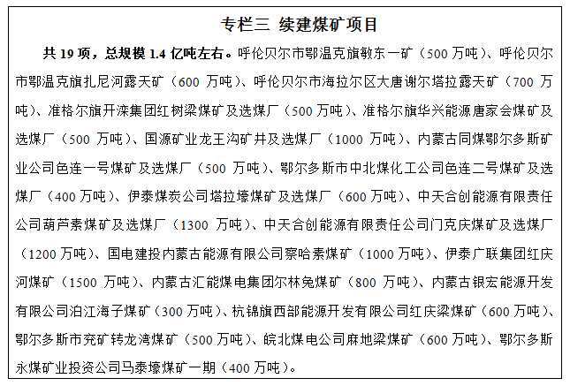 穩(wěn)步推進煤炭生產(chǎn)基地建設(shè)。統(tǒng)籌安排煤炭總量和布局,依托勝利、五間房、白音華、準格爾、東勝、上海廟、伊敏、寶日希勒等大型整裝煤田,按照國家總體能源戰(zhàn)略部署,重點圍繞保障煤電、現(xiàn)代煤化工等主要耗煤項目用煤需求,推動鄂爾多斯、錫林郭勒、呼倫貝爾三大煤炭生產(chǎn)基地建設(shè),力爭到2020年原煤產(chǎn)量控制在11.5億噸左右?!笆濉逼陂g,建成投產(chǎn)煤礦項目35項,總規(guī)模2.5億噸左右。續(xù)建煤礦項目19項,總規(guī)模1.4億噸左右,其中鄂爾多斯1.2億噸、呼倫貝爾2000萬噸左右。圍繞煤電和煤化工基地配套用煤項目,擬新開工并建成煤礦項目16項,總規(guī)模1.2億噸左右,其中鄂爾多斯新增產(chǎn)能6500萬噸、錫林郭勒新增產(chǎn)能4500萬噸、通遼新增產(chǎn)能600萬噸左右。