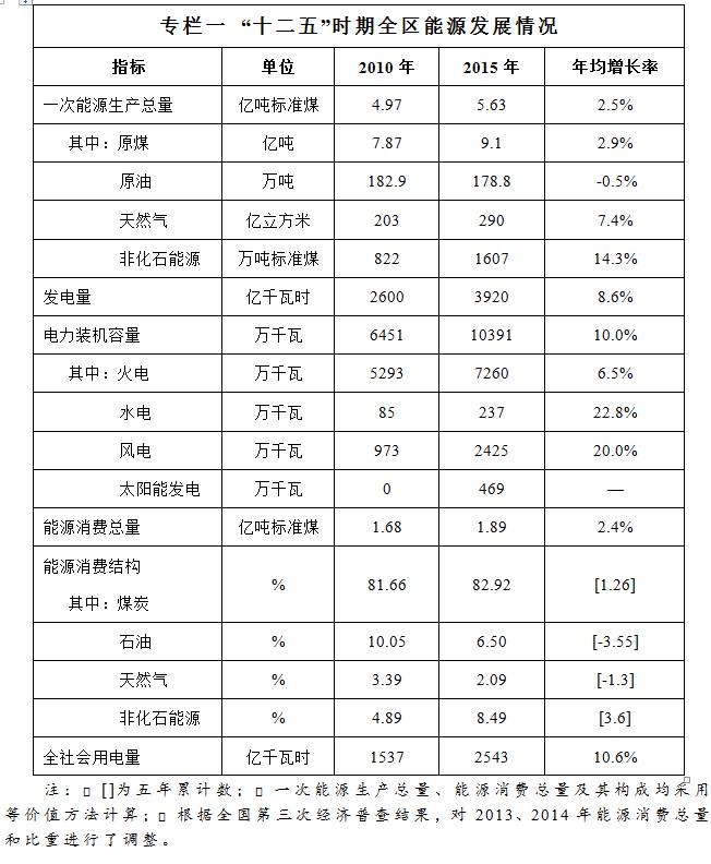 能源結(jié)構(gòu)不斷優(yōu)化?!笆濉逼陂g,全區(qū)能源結(jié)構(gòu)由傳統(tǒng)化石能源為主逐步向化石能源和非化石能源并重轉(zhuǎn)變,能源發(fā)展呈現(xiàn)出多元化、低碳化的特征。天然氣和非化石能源在一次能源生產(chǎn)總量中的比重分別提高至2015年的6.9%和2.9%,較2010年分別提高1.5個和1.2個百分點;煤炭在一次能源生產(chǎn)總量中的比重降低至2015年的90%以下,較2010年下降2.6個百分點;非化石能源裝機比重由2010年的16.4%提高至30.1%;非化石能源消費比重提高至8.5%,“十二五”期間累計提高3.6個百分點。