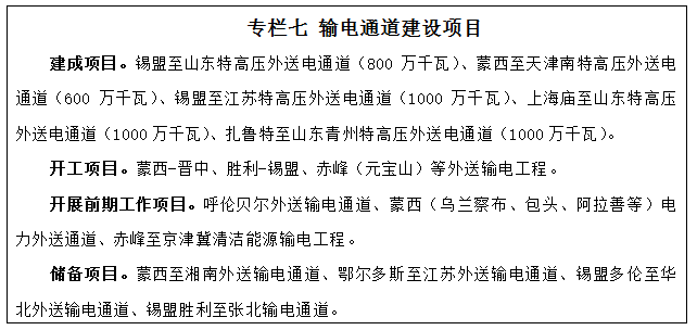 結(jié)合全國電力供需整體形勢、電源基地開發(fā)進度等因素,堅持適度超前的原則,采用大容量、遠距離、高效率的特高壓先進輸電技術(shù),加快電力外送通道及配套接網(wǎng)工程建設(shè),進一步提高電力外送規(guī)模?!笆濉逼陂g,建成錫盟-山東、錫盟-江蘇、上海廟-山東、蒙西-天津南、扎魯特-山東青州等特高壓外送電通道。爭取開工建設(shè)蒙西-晉中、勝利-錫盟、赤峰(元寶山)等外送輸電工程。結(jié)合受端市場情況,積極推進呼倫貝爾、蒙西(烏蘭察布、包頭、阿拉善等)、赤峰-京津冀等電力外送通道論證。力爭到2020年電力外送形成“兩交三直”特高壓、多條超高壓外送通道格局。
