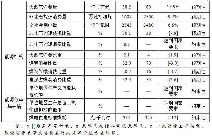 ――能源結(jié)構(gòu)。進一步提高非化石能源裝機和消費比重,非化石能源裝機比重達到38%左右,非化石能源消費比重達到國家要求。天然氣消費比重提高到4%左右,煤炭消費比重降低到79%左右。煤炭終端消費比重下降到16%左右,電煤占煤炭消費比重提高到55%左右。