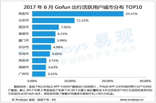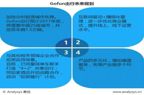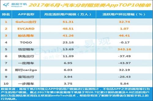 2017年8月8日,交通運(yùn)輸部、住房城鄉(xiāng)建設(shè)部聯(lián)合發(fā)布《關(guān)于促進(jìn)小微型客車租賃健康發(fā)展的指導(dǎo)意見》,鼓勵(lì)汽車分時(shí)租賃市場發(fā)展。 在資本助力及政策支持下,在消費(fèi)升級的大背景下,未來,汽車分時(shí)租賃市場用戶規(guī)模將會(huì)保持穩(wěn)健增長態(tài)勢。 2017年6月,在汽車分時(shí)租賃TOP10榜單中,Gofun出行以51.31萬人的月活用戶規(guī)模位居榜首,EVCARD、盼達(dá)用車分別以48.51萬人、41.26萬人的月活用戶規(guī)模位列榜單第二、第三位。 Gofun出行是首汽集團(tuán)旗下首汽智行科技有限公司打造的新能源汽車分時(shí)租賃項(xiàng)目,背靠首旅集團(tuán)及首汽集團(tuán),在資本、場地、運(yùn)營、品牌、充電設(shè)施等方面具先天優(yōu)勢。截止2017年7月底,Gofun出行共投入新能源汽車約1.2萬輛,覆蓋中國21個(gè)城市。