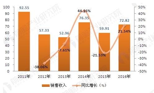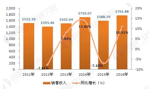 2011-2016年我國金屬機(jī)床行業(yè)銷售收入變化情況(單位:億元,%)