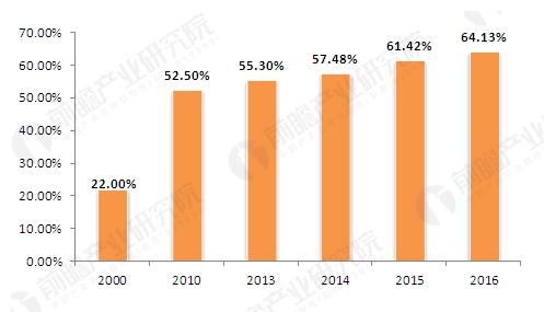 2000-2016年中國金屬切削機(jī)床產(chǎn)值數(shù)控化率(單位:%)