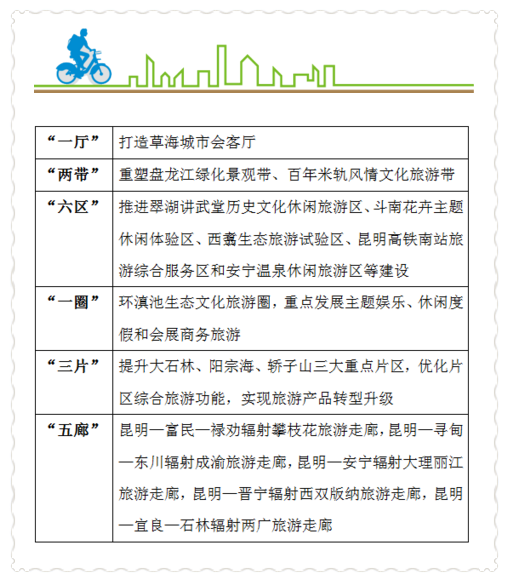 規(guī)劃提出,未來3年昆明要大力實施全域旅游發(fā)展戰(zhàn)略,實現(xiàn)把昆明建設成為世界知名旅游城市、國際旅游集散地和目的地。重點建設“一廳兩帶六區(qū)”“一圈三片五廊”。