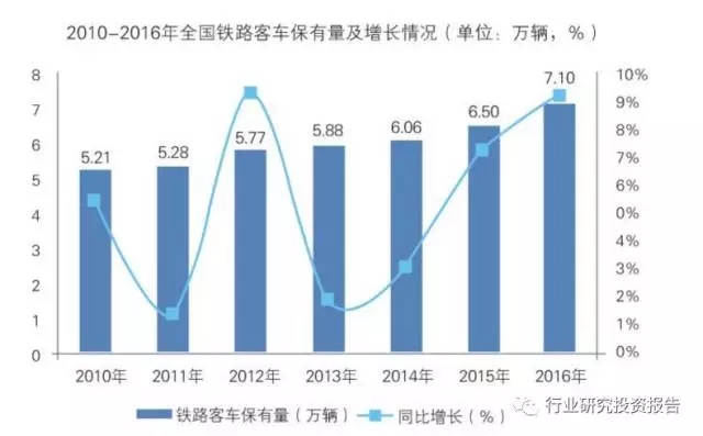 從鐵路客車保有量來看,2016年全國鐵路客車擁有量為7.1萬輛,比上年末增加0.3萬輛;其中,動車組2586標(biāo)準(zhǔn)組、20688輛,比上年增加380標(biāo)準(zhǔn)組、3040輛。
