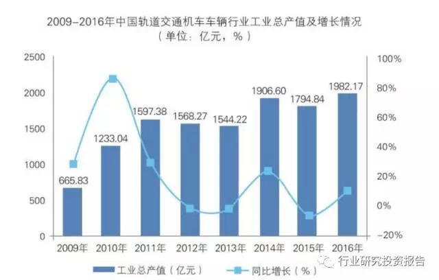 2009-2016年,中國軌道交通機車車輛行業(yè)工業(yè)總產(chǎn)值呈波動變化趨勢,其中,2010年行業(yè)工業(yè)總產(chǎn)值為1058.24億元,同比增長58.93%,為近年來最大增幅。2015年,行業(yè)工業(yè)總產(chǎn)值為1794.84億元,同比下降5.86%。2016年,行業(yè)工業(yè)總產(chǎn)值為1982.17億元,同比增長10.44%。