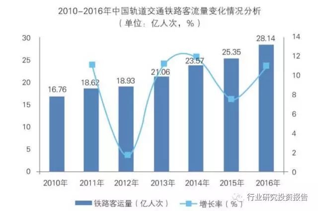 從近五年我國鐵路旅客發(fā)送量可以看出,整體上呈逐年上升趨勢,2016年的旅客發(fā)送量達到28.14億人次,同比增長11.01%。