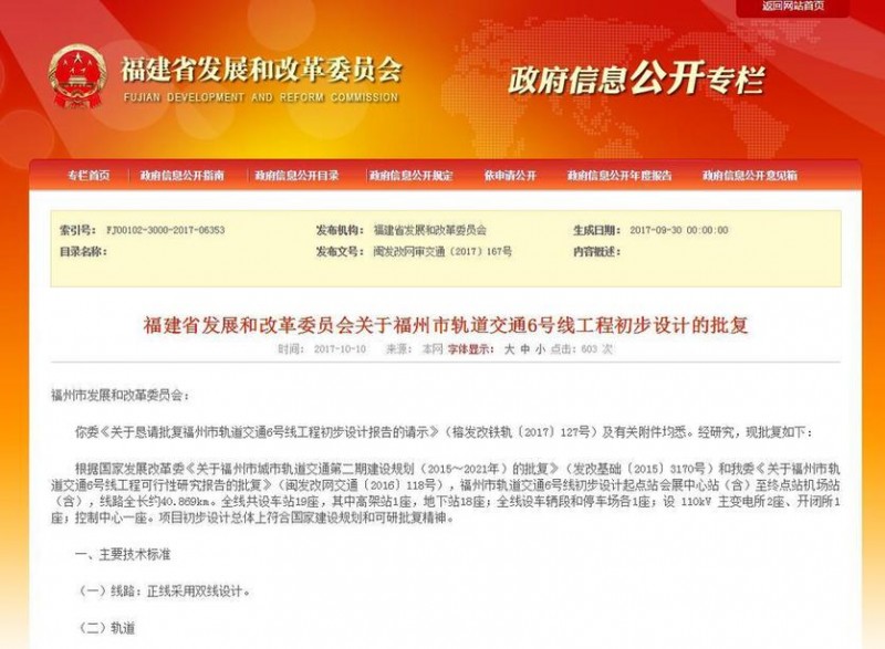 10日,福建省發(fā)改委網(wǎng)站發(fā)布《福建省發(fā)展和改革委員會(huì)關(guān)于福州市軌道交通6號(hào)線工程初步設(shè)計(jì)的批復(fù)》,其中指出:福州市軌道交通6號(hào)線初步設(shè)計(jì)起點(diǎn)站會(huì)展中心站(含)至終點(diǎn)站機(jī)場(chǎng)站(含),線路全長(zhǎng)約40.869km。全線共設(shè)車(chē)站19座,其中高架站1座,地下站18座!
