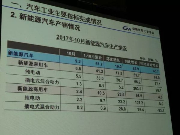 11月10日,中國汽車工業(yè)協(xié)會召開10月份汽車產銷數(shù)據(jù)發(fā)布會。在新能源汽車部分,10月份產銷量分別為9.2萬輛和9.1萬輛 ,同比增長分別為85.9%和106.7%;2017年前10月累計產銷分別為51.7萬輛和49萬輛 ,同比增長分別為45.7%和45.4%。