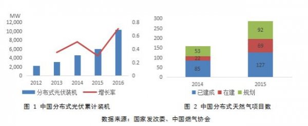 從中國的視角來看,隨著中國經濟發(fā)展進入“新常態(tài)”,中國能源行業(yè)發(fā)展的根本目標已是天壤之別。過去,中國經濟持續(xù)的高速增長導致能源供應短缺,那時的時代主線是擴大能源生產以保障供應;如今,經濟發(fā)展放緩,能源供給能力已遠超需求,反而是技術、環(huán)境、價格、效率等問題制約了進一步發(fā)展,中國能源發(fā)展的問題從數量問題逐漸轉為質量問題。短短五年間,中國見證了可再生能源在裝機容量方面的爆發(fā)式增長。然而,嚴重的“棄風棄光”問題成為了限制可再生能源進一步發(fā)展的瓶頸。分布式能源的特征符合中國下一階段能源發(fā)展“提質增效”的目標,因此分布式能源在中國也顯現了迅猛崛起的勢頭。分布式光伏累計裝機從2012年時的2.3GW快速上升至2016年底的10.3GW(如圖),年均增長率高達46%;分布式天然氣項目數(包括建成、在建、規(guī)劃)從2014年時的160個增長至2015年底時的288個。