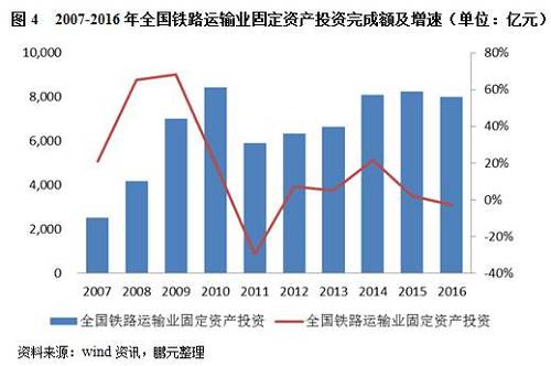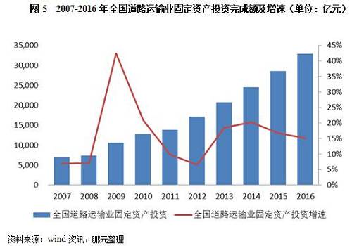 交通運(yùn)輸固定資產(chǎn)投資主要來自于鐵路和道路交通領(lǐng)域。鐵路方面,2016年我國完成鐵路固定資產(chǎn)投資7,729.94億元,規(guī)模與上年略有下滑。道路運(yùn)輸業(yè)方面,2016年我國完成道路交通固定資產(chǎn)投資32,937.34億元,同比增長15.10%,仍維持了較高的增速。