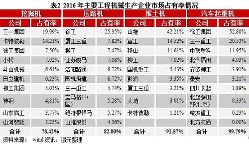從具體產(chǎn)品方面看,挖掘機(jī)是工程機(jī)械最大的細(xì)分產(chǎn)品市場,生產(chǎn)廠家主要有三一集團(tuán)、卡特彼勒、徐工集團(tuán)、小松等,近年內(nèi)資品牌產(chǎn)品質(zhì)量逐步提升、售后服務(wù)日趨完善,同時(shí)產(chǎn)能擴(kuò)張較快,市場份額不斷提高,2016年國內(nèi)品牌市場占有率合計(jì)達(dá)50.66%,已占據(jù)了一半以上的挖掘機(jī)市場;2016年三一集團(tuán)市場占有率達(dá)19.99%,占有率較上年進(jìn)一步提高,仍是挖掘機(jī)市場的市場領(lǐng)先企業(yè)。推土機(jī)領(lǐng)域,山推重新成為占有率最高的企業(yè),2016年市場占有率達(dá)42.21%,其次是宣工和移山。起重機(jī)主要包括汽車起重機(jī)、履帶起重機(jī)、隨車起重機(jī)三大類,其中汽車起重機(jī)產(chǎn)銷量最大,目前汽車起重機(jī)主要廠商有徐工集團(tuán)、中聯(lián)重科、三一重工(600031,股吧)等,這三家廠商市場占有率合計(jì)達(dá)85.28%,市場集中度很高??傮w來看,2016年我國工程機(jī)械主要產(chǎn)品的市場集中度均較高,且國內(nèi)企業(yè)在工程機(jī)械市場上已占據(jù)主導(dǎo)地位。