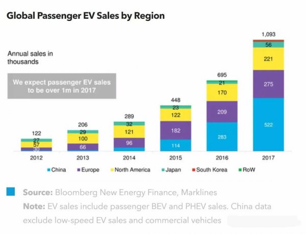 全球電動(dòng)乘用車的銷量不斷增長,在2017年將超過100萬輛。中國是全球電動(dòng)車第一消費(fèi)大國,至今年年底其電動(dòng)車銷量將占全球總銷量的近50%。燃油消耗量限值、新能源汽車積分制度、電池技術(shù)的改進(jìn)、對(duì)城市空氣質(zhì)量的關(guān)注以及越來越多的汽車制造商對(duì)電動(dòng)車發(fā)展作出的承諾均推動(dòng)了電動(dòng)車市場(chǎng)的迅猛發(fā)展。