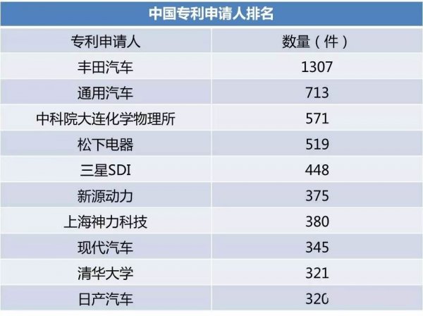 在中國申請(qǐng)專利的申請(qǐng)人中,排在最前的也是日本豐田汽車,共1307項(xiàng)。通用汽車以713項(xiàng)位居第二。本土研究機(jī)構(gòu)中科院大連化學(xué)物理所排名第三,新源動(dòng)力股份有限公司、上海神力科技、清華大學(xué)分別排名第六、第七和第九。