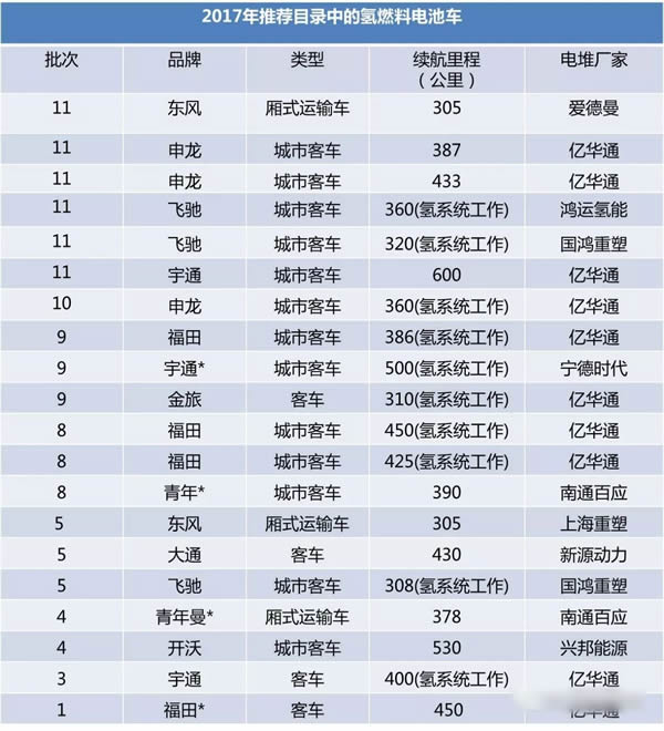 2017年12月初,工信部公布了第11批新能源汽車推薦目錄。今年以來,全國已有217家企業(yè)的3113個(gè)車型進(jìn)入目錄。在這其中,共有20款氫燃料電池入選,占全部車型的千分之六。車型以客車為主,共17輛,另有3輛為廂式運(yùn)輸車。品牌分布較為均勻,其中北汽福田有4款福田牌客車入選,上海申龍、佛山飛馳、宇通客車各有3款入選。