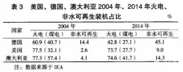 ?從表3中可以看出,德國、美國、澳大利亞的煤電裝機占比都有所下降,2014年德國、美國的煤電裝機占比都低于30%,已處于較低水平。
