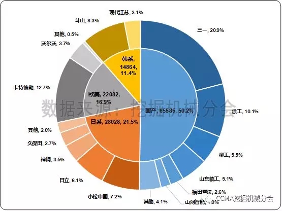 2017年國產(chǎn)、日系、歐美和韓系品牌銷量分別為65585、28028、22082和14864臺,市場占有率分別為50.2%、21.5%、16.9%和11.4%。三一、卡特彼勒和徐工占據(jù)國內(nèi)市場前三位。