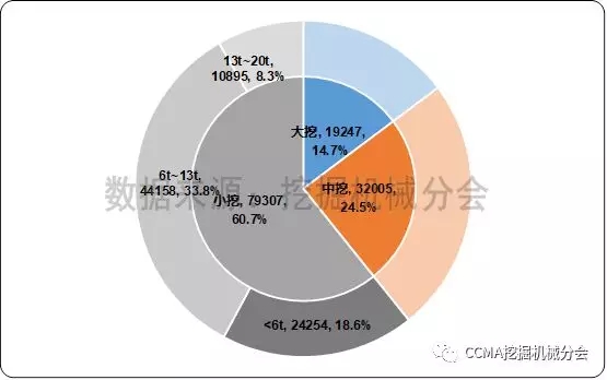 2017年國內(nèi)大挖、中挖、小挖銷量分別為19247、32005、和79307臺,市場份額分別為14.7%、24.5%和60.7%。小于6噸的微型挖掘機(jī)和6~13噸的小型挖掘機(jī)占據(jù)國內(nèi)超過一半的市場份額。