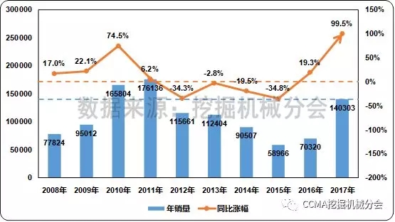 根據(jù)中國工程機(jī)械工業(yè)協(xié)會挖掘機(jī)械分會統(tǒng)計(jì)數(shù)據(jù),2017年納入分會統(tǒng)計(jì)的25家主機(jī)制造企業(yè)共銷售各類挖掘機(jī)械產(chǎn)品140303臺(含出口),較去年同期上升99.5%。其中2017年12月份銷量14005臺,同比上漲102.6%,環(huán)比上月上漲1.32%。
