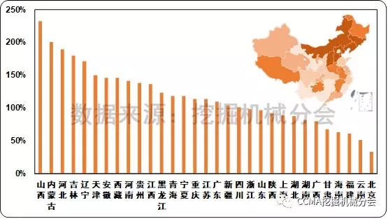 圖10 2017年國內(nèi)挖掘機(jī)械市場各省份銷量同比變化情況