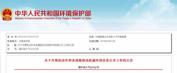 環(huán)保部《關(guān)于開展機(jī)動(dòng)車和非道路移動(dòng)機(jī)械環(huán)保信息公開工作的公告》