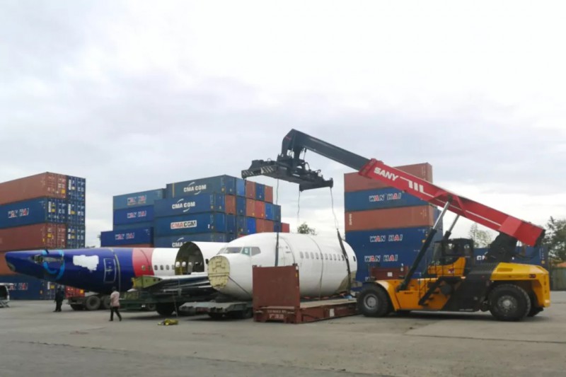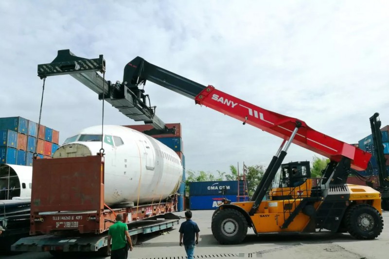 1月5日,印尼東亞堆場迎來了一次特殊的吊裝項目。那就是將一架波音737拆分后的部件,準確無誤地起吊,并固定在特種集裝箱上。擔當這一重要吊裝任務的起吊設備正是三一正面吊。