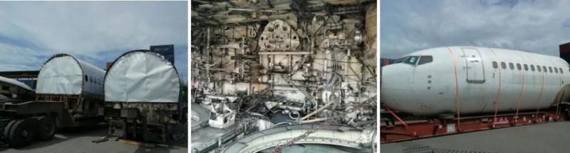 貨代公司負責人介紹說,此架波音737-300是當?shù)睾娇展緢髲U產(chǎn)品,被轉(zhuǎn)賣后的主要用途是培訓或主題餐廳等。飛機共拆分為機頭、機身、機尾和機翼四部分,其中機尾部分尺寸達到14.4m*3.72*3.5m,機翼部分尺寸15.6m*4.5m*3m。