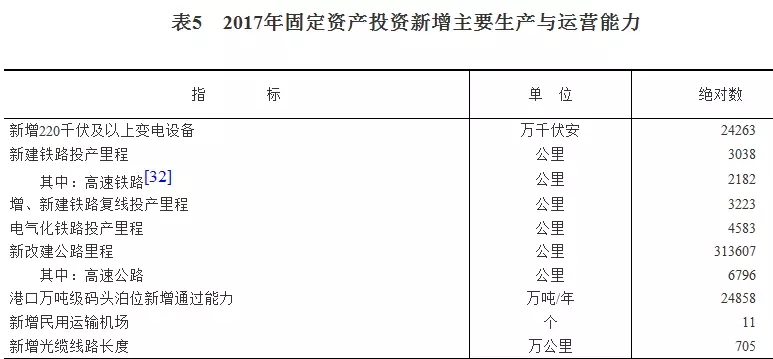 2017年固定資產(chǎn)投資主要集中在電力、鐵路、公路、港口碼頭、機場等領域。新建鐵路3038公里,其中,高鐵2182公里(2016年為3281公里,高鐵超1900公里),說明鐵路領域建設投資正在減少,但高鐵勢頭卻在走高。2017年全國新改建公路313607公里相較于2016年的324898公里有所減少。2017年新增民用運輸機場8個,和2016年持平。