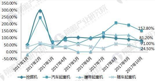 圖表1:2017年1-10月塔吊機(jī)械主要產(chǎn)品銷量月度同比增速變化(單位:%)