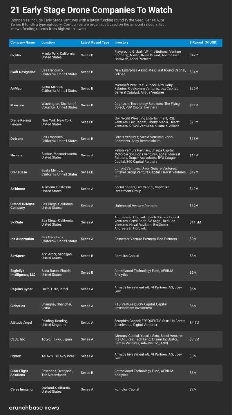 無人機創(chuàng)企層出不窮,在此,CrunchBase追蹤了2017年和2018無人機領(lǐng)域的種子輪、A輪和B輪融資情況,繪制了一份值得業(yè)界關(guān)注的早期無人機企業(yè)的top21名單。這些公司業(yè)務(wù)范圍從商用到個人,從服務(wù)到無人機管控,均有涉及。