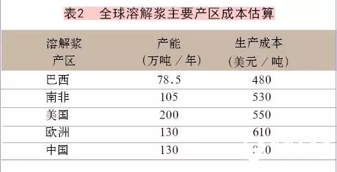 溶解漿的成本主要構(gòu)成為:原材料:木片;輔材:化工料;能源:水、電;人工及財務(wù)費用等五大部分。從原材料看,木片的主要來源是可再生森林資源,國外的溶解漿生產(chǎn)企業(yè)多數(shù)擁有自己的森林資源以及伐木許可證。但是獲取資源的成本不一,巴西、南非等國木片成本較低;而美國、加拿大、歐洲等國家和地區(qū)由于其有健全的森林法規(guī)和伐木許可制度,獲得木片成本相對較高;中國從20世紀(jì)末開始實施退耕還林等生態(tài)環(huán)保制度,伐木成本相對高昂,多數(shù)溶解漿企業(yè)目前所用的原料均從國外進口,獲取木片資源成本高昂。人工方面,美國、歐洲、中國人工及財務(wù)費用較高,巴西、南非兩國相對低廉。故木片與人工成本是拉開全球溶解漿生產(chǎn)成本的主要因素。從表2可以看出,中國的溶解漿成本是全球最高,巴西的溶解漿成本相對來說較低。