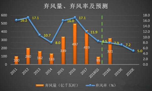 通過(guò)分析棄風(fēng)率,從上圖可知,從2011年至2016年,棄風(fēng)率呈先下降后上升趨勢(shì),到2016年棄風(fēng)率達(dá)到了最高值17.1%,與2012年持平,此后棄風(fēng)率不斷下降,2017年為11.9%,環(huán)比下降30.41%,2018年一季度為8.7%,預(yù)計(jì)到2018年年底將降至7.9%,2019年將會(huì)達(dá)到7.2%,2020年降至5%。