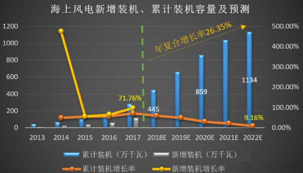 海上風(fēng)電新增裝機(jī)、累計(jì)裝機(jī)及預(yù)測(cè)(至2022年)