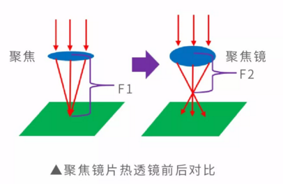 由于光學(xué)元件質(zhì)量差、臟污、損壞等原因造成對激光吸收率增大,光學(xué)元件受激光束連續(xù)較長時間照射后,溫度升高產(chǎn)生熱變形,進(jìn)而引起透過型光學(xué)元件的折射率和反射型光學(xué)元件的反射方向發(fā)生變化。熱透鏡效應(yīng)會改變激光焦點(diǎn)(束腰)的位置,進(jìn)而影響應(yīng)用效果。